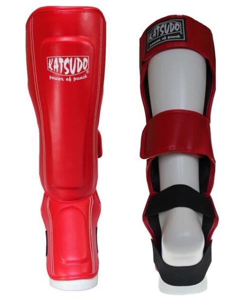 A Katsudo márkájú, piros műbőr lábszár- és lábfejvédő megerősített párnázott réteggel rendelkezik, jobb védelmet nyújt a láb számára. A láb és a sarok körül gumipánttal van rögzítve. Anyaga: műbőr, gumi, tépőzár. Ideális küzdősportokhoz és erősportokhoz, edzéshez.